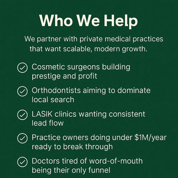 Tailored solutions for cosmetic surgeons' orthodontists, and Lasik clinics. Services Launching 2025.